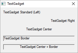 If OpenWindow(0,0,0,270,160,"TextGadget",#PB_Window_SystemMenu | #PB_Window_ScreenCentered) TextGadget(0, 10, 10,250,20,"Gadget texte standard (texte aligné à gauche)") TextGadget(1, 10, 40,250,20,"Gadget texte (texte aligné à droite)", #PB_Text_Right) TextGadget(2, 10, 70,250,20,"Gadget texte (texte centré)",#PB_Text_Center) TextGadget(3, 10,100,250,20,"Gadget texte avec bordure",#PB_Text_Border) TextGadget(4, 10,130,250,20,"Gadget texte (texte centré) + bordure", #PB_Text_Center | #PB_Text_Border) Repeat : Until WaitWindowEvent()=#PB_Event_CloseWindow EndIf