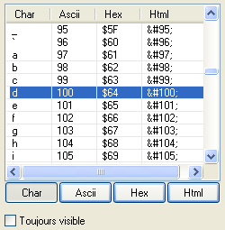 Table des caractèresLa table affiche une liste des 256 premiers caractères unicode avec leurs correspondances en décimal, hexadécimal et HTML. En double-cliquant sur une ligne, ce caractère sera inséré dans le code source. Les boutons en dessous de la liste permettent de choisir le format dans lequel le caractère sera inséré.