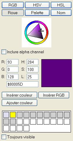 Le bouton "Insérer Couleur" insère la valeur hexadécimale de la couleur courante dans le code source. Le bouton "Insérer RGB" insère la couleur comme le ferait un appel à la fonction RGB() ou RGBA()dans le code. Le bouton "Ajouter couleur" permet d'ajouter la couleur actuelle dans la zone d'historique. En cliquant sur une couleur dans cette zone, permet à cette couleur de devenir la couleur courante.