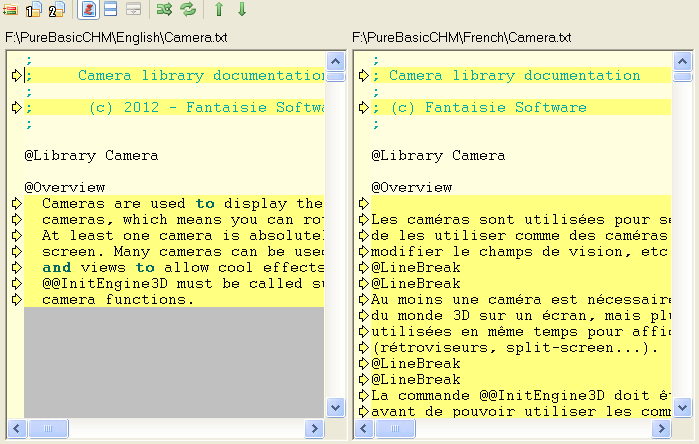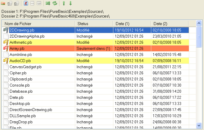 Les fichiers sont affichés côte à côte avec les différences marquées de la manière suivante: Les lignes affichées en rouge ont été enlevées dans le fichier, les lignes indiquées en vert ont été ajoutées dans le fichier et les lignes indiquées en jaune ont été modifiées.