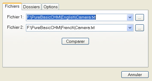 Comparer Fichiers/DossiersCet outil permet de comparer deux fichiers (texte) ou des répertoires et de mettre en évidence leurs différences. L'onglet "Options" peut être utilisé pour ignorer des différences telles que les espaces ou les changements majuscules/minuscules.