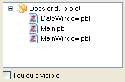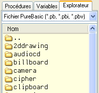 Rafraîchir les données de l'auto-complétion - Rescanne tous les fichiers du projet pour actualiser les données de l'auto-complétion.L'outil Explorer affiche une liste de fichiers et de répertoires à partir de laquelle il est possible d'ouvrir rapidement n'importe quel type de fichier, en double-cliquant dessus. Les fichiers PureBasic (*.pb, *.pbi, *.pbp, *.pbf) seront chargés directement dans la zone d'édition et les fichiers reconnus par l'éditeur (textes et binaires) seront ouverts par le visualisateur interne de fichiers.