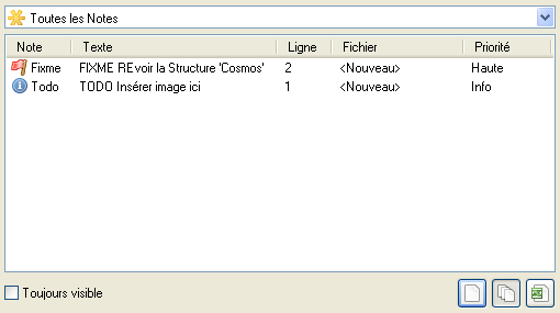 Chaque problème affiché correspond à un commentaire dans le code. Un double-clic sur la Note affiche la ligne de code. Les Notes peuvent être affichées pour le fichier en cours, ou pour plusieurs fichiers (tous les fichiers ouverts, ou tous les fichiers qui appartiennent aux projet courant). La liste peut également être exportée au format CSV.