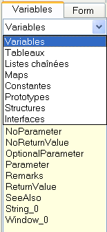 Visualisateur de variablesLe visualisateur de variables peut en fait afficher les variables, tableaux, listes, constantes, structures et interfaces définis dans le source en cours d'édition, ou dans tous les fichiers ouverts. La configuration de ce qui doit être affiché se fait dans les préférences.