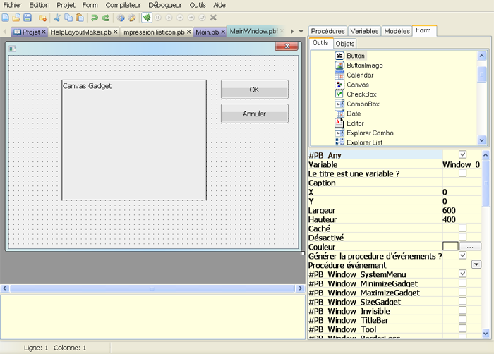 Concepteur de fenêtreLe concepteur de fenêtre (ou de formulaire) peut être utilisé pour concevoir l'interface utilisateur de votre application. Pour plus d'informations, reportez-vous au chapitre concepteur de fenêtre.